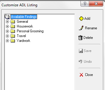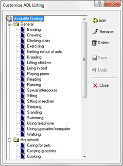ChiroPadEMR provides the ability to Add, Rename, and Delete Categories and individual Activities of Daily Living.