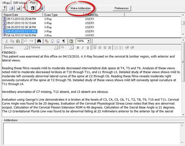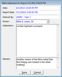 After the DIR has been saved, it can be changed, edited, or modified ONLY by using the Addendum tool (figure 39). Click on the Addendum button (figure 38) at the top center to open the Addendum window. Note that default information is entered automatically, showing the Date of the Addendum, the Initial Report Date, and which member of the office staff is making this entry. Required data that must be entered includes the name of the doctor that is making this Addendum, the Addendum itself (the information being added to the report), and the Reason the Addendum is being made. This format is required at both the State and Federal levels.