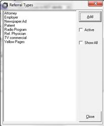 The item that was just entered is now in the Referral Types screen, in alphabetical order. Click the Close button to complete the process.