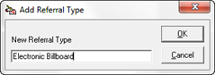 If the item needed is NOT in the system click the Add button in the upper right corner to open a text box to enter the New Referral Type in the space provided (figure 6) and click OK.