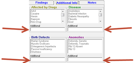Several sections of ChiroPadEMR include Additional Boxes to add items to specific categories of data. An example of this is on the Additional Info tab of the Extremity Exam window (figure 4).