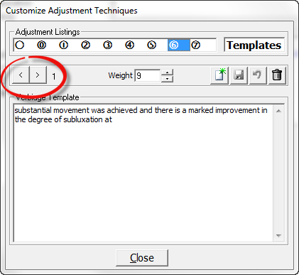 Each Adjustment Result Template is assigned a Weight between 1 and 9. This Weight determines the frequency with which each iteration will be used by ChiroPadEMR. The higher the number, the greater will be the randomization of the verbiage. For example, if there were only 2 Adjustment Result Templates and Template A has a Weight of 1 while Template B has a Weight of 9, for each time Template A appears, Template B will appear 9 times. For the greatest degree of text randomization in the SOAP notes, give every Adjustment Result Template a Weight of 9.