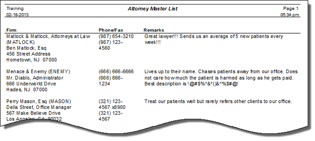 The Attorney Master List Report (figure 15) is a list of the attorneys that have been entered in ChiroSuiteEHR. To generate the Attorney Master Report from the Catalogs section click on it. Choose the filter, sort and format options from the pop up and click OK.