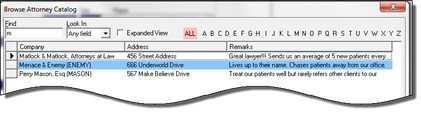 When the selection is 0-Patient, 1000-Attorney, 2000-Ref Physician, or 3000-Employer, the system opens up access to either the patient list or the appropriate catalog (figure 3). Just click on the Browse button to search for, find, and enter the referring source in the patient’s file.