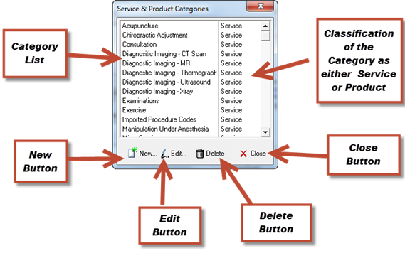 The products and services that are performed in the practice can be grouped by Category. This sorts the products and services in the Procedure Pick List and in reports such as the Procedure Catalog Master List. Select the Category that this product or service belongs in from the drop down list. The list of product and service categories may be edited (create, modify, or delete) by clicking on the Categories button at the top of the window. This opens the mini-window shown in figure 29.