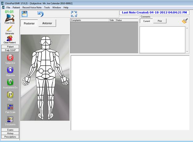 Depending on the Subjective Complaint of the patient, it may be necessary to change the view of the body. Note the buttons in the upper left corner of this window that allow the selection of either Posterior or Anterior view. By factory default, ChiroPadEMR is set to automatically show the Posterior view. This default can be changed in Settings. Please refer to Chapter 9 User Preferences and Settings. It is easy to flip back and forth between the Anterior and Posterior body views by clicking on the appropriate button.