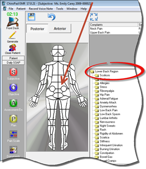 Entering a Subjective Complaint for the patient is quick and easy. Point the mouse at the part of the body in which the patient has his/her complaint. Click on that body area and a list of possible problems appears (figure 2).