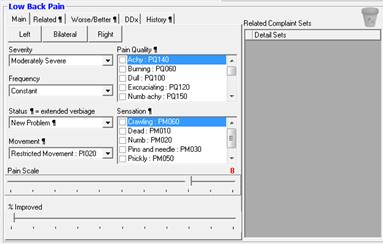 The Subjective screen (figure 1) is where the patient’s Subjective Complaints are entered and monitored on each visit. The first time this window is accessed for a patient, prior to making any entries, the Complaints box is empty and nothing is highlighted on the body view.