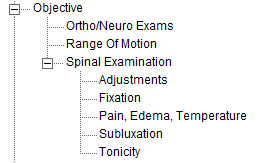 On the Customize Menu, click on the Plus (+) Sign next to Objective to enter the Objective Findings Customization area. This opens the list of items (figure 1) that may be customized in the Objective Findings window. It may be necessary to also click on the Plus (+) Sign next to Spinal Examination.