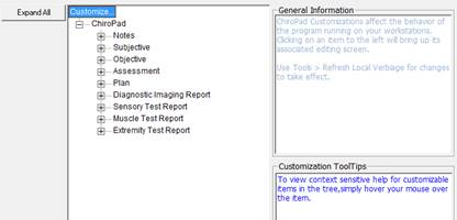 The Customization window (figure 2) opens with a menu list of the customizable sections of ChiroPadEMR. Each section may be opened individually by clicking on the plus (+) next to the section name, or they may be opened as a group by clicking the Expand All button on the left.