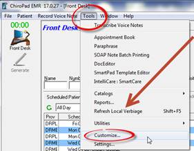 To access the Customize Section of ChiroPadEMR, make sure ALL patient files are closed and then click on Tools in the toolbar at the top upper left of the window (figure 1) and select Customize.