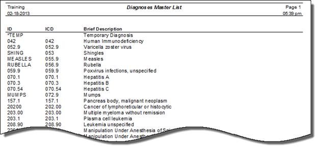 The Diagnosis Master List Report (figure 17) produces a list of all the diagnoses in ChiroSuiteEHR. Choose the filter, sort and format options from the pop up and click OK to generate the report.