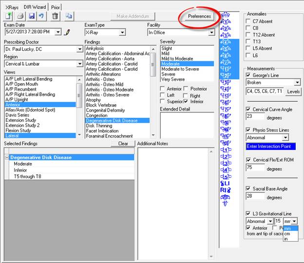 The Diagnostic Imaging Report (DIR) (figure 31) is for the doctor to record the findings from any type of diagnostic film that he/she is reading. The DIR window enables point and click selections, and then converts the selections into dictation quality English. Once the entries are saved, the system maintains them as a separate and distinct Diagnostic Imaging Report as well as placing those findings in the SOAP note, provided that the Exam Date of the report is the same as today’s current date and that the DIR is completed prior to the creation of today’s current SOAP note.