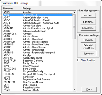 The DIR Findings section is where the Templates and Verbiage are created to make the DIR generate text in the ideal manner for the practice. Open the section by clicking on DIR Findings from the Customize window. This opens the Customize DIR Findings window (figure 5).