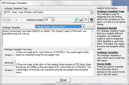 The DIR Verbiage Templates were created with ease of function in mind. There can be as many iterations of each Verbiage Template Type as the practice desires. The system already includes 1 to 5 iterations for each Verbiage Template Type. Each practice has the ability to add more iterations.