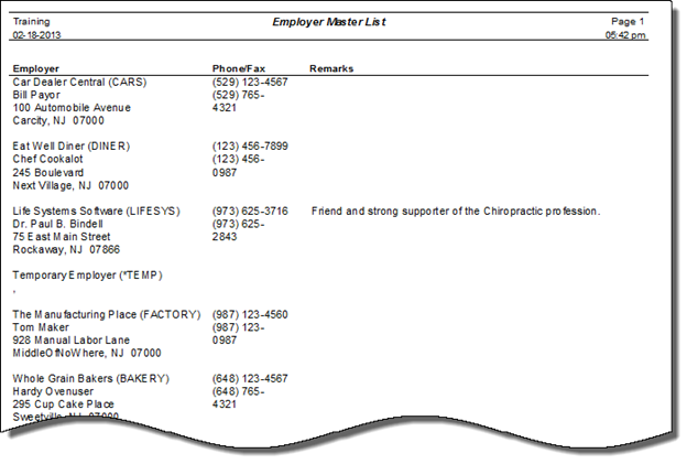 The Employer Master List Report (figure 19) is a list of all patient employers that have been entered in ChiroSuiteEHR. Choose the filter, sort and format options from the pop up and click OK to generate the report.