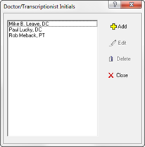 To add Initials, click the Add button next to the yellow plus (+) symbol. A box will open in which the providers name and credentials are typed in. Click OK after typing and the Initials will appear in the box. Then click the Close button.