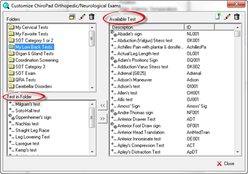 Before entering a new test or sign in ChiroPadEMR, check this list to see if the item needed is already in the program. Remember to use the scroll bar on the right side of the box. If the needed test is on the list, simply add it to the appropriate folder.