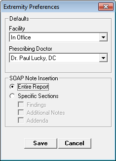 •Soap Note Insertion – Most practices set the default as Entire Report. This means that the complete Extremity Exam will become part of today’s current SOAP note, provided that it is created prior to the generation of the SOAP note. However, there are those offices that prefer to include only a portion of the Extremity Exam in the SOAP note. If this is the case, click on Specific Sections and then check off the sections that should be included and leave the others unchecked.
