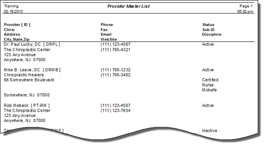The Provider Master List Report (figure 20) is useful in large practices with many providers (doctors, therapists, etc.). It is a list of all the providers that are in the practice. Choose the filter, sort and format options from the pop up and click OK to generate the report.