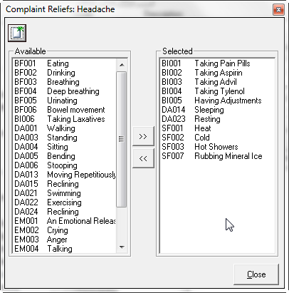 In the Reliefs window there are 2 columns, Available and Selected. The Available column shows all the items that may be applied, but have not been selected. The items listed in the Available column will NOT be displayed in the patient’s Subjective Complaint Worse/Better tab window. The Selected column lists all the items that will be available in the patient’s Subjective Complaint Worse/Better tab window when this Complaint is chosen. In between the 2 columns are a Right Arrow and a Left Arrow.