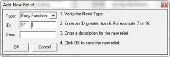 •The ID for the New Reliefs has 2 parts, the first is automatically entered by the ChiroPadEMR based on the Type selected from the drop down box. The second part of the ID is a number that must be assigned to this New Relief, and ChiroPadEMR will display what this number must be greater than. By displaying the number that the new entry must be greater than, it prevents the attempt to enter a duplicate number.