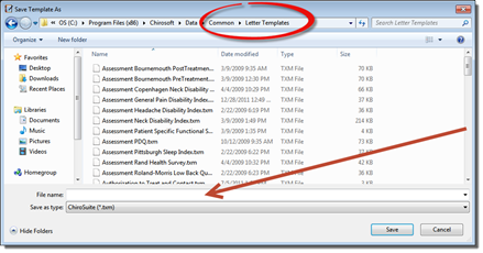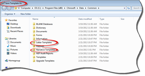 Letter Templates will be accessible through the Letters option in the patient file, both in ChiroOffice and ChiroPadEMR. The Letter Templates are also accessible for bulk production in ChiroOffice by selecting Tools and then clicking on Letters. Narrative Templates are available only in the Narratives section of a patient file in ChiroPadEMR. Double click the location (Letter or Narrative) where the template should be saved. The section selected will open (figure 11). Verify that it is the correct location and type in the name of the new template at the bottom of the window in the text box labeled File Name.