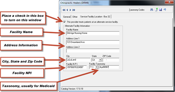 The information on this tab (Figure 38) is used by ChiroOffice for populating information on the CMS-1500 claim form, box 32. If this provider does give service to patients on a regular basis at a facility other than the office, place a check in the box and then enter the information in the boxes on this screen.
