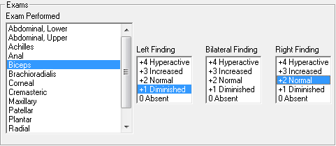If the Preferences default Exam Type is Tendon Reflexes, then the Exam Performed box on the left, just below the Exam Date, displays the list of Tendon Reflexes (figure 40). If needed, click on the Exam Type drop down arrow to change from the default Tendon Reflexes to the Manual Stimulation Tests. Click on the name of the Reflex that was done to activate the Findings boxes (figure 43).
