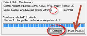 To make the patients Inactive determine the number of months during which the patients did not have any visits. Enter that number in the box labeled Select patients who have no activity within…month(s). Click on the Calculate button. On the top line, the number of current Active patients is displayed. After clicking Calculate, Database 32 shows the number of patients selected as well as the the new number of Active patients. If this appears to be correct, click the Make Inactive button in order to complete the process. Depending on the number of patients begin made Inactive as well as the processing power of the computer, it make take several minutes to complete.